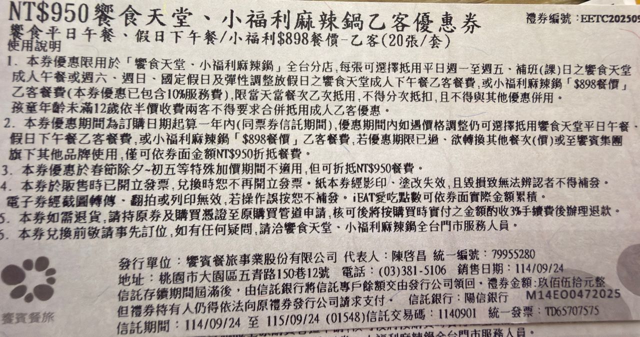 標題[交易] 饗食天堂平日午餐/假日下午餐實體券