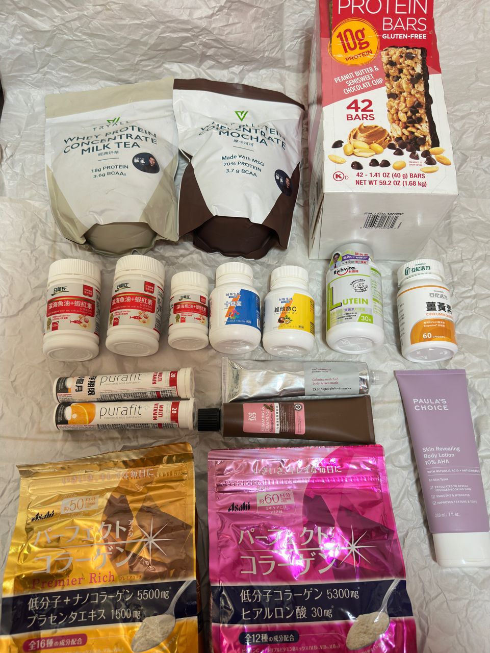 物 品:蝦紅素/維他命C/葉黃素等營養品、乳清蛋白粉、乳液、維他命發泡錠、膠原
