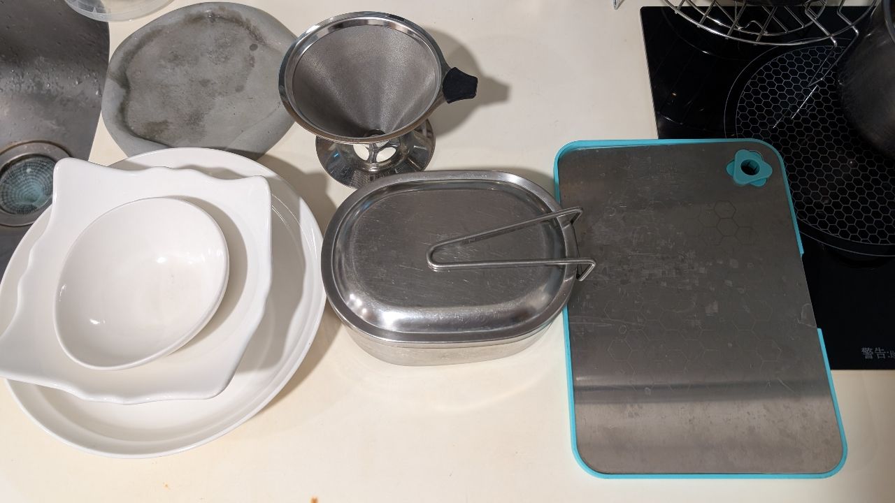 物 品:碗盤 中鋼砧板 水泥自製隔熱墊(也可放雜物)便當盒 咖啡濾網