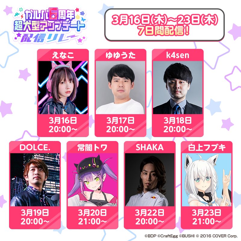 03/15 20:00 博衣こより生日紀念Live 03/18 hololive 4th fes. Our Bright Parade Day1(售票) 03/19 holo*27(售票) 03/19 hololive 4th fes. Our Bright Parade Day2(售票) 03/21 Ceres Fauna誕生日 03/22 星街すいせい誕生日+活動五周年 03/25 17:00 Mel&Nene VARK(售票) 03/25 Vestia Zeta一周年 03/26 Kaela Kovalskia一周年 03/27 Kobo Kanaeru一周年 03/28 Nene生日紀念Live 休息中成員 HAACHAMA 未定 流感休息 **************************************** 若有錯誤或遺漏請版友協助提醒或補充,謝謝 **************************************** --