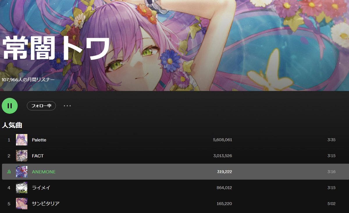 Towa原創"ANEMONE"Spotify 30萬播放達成