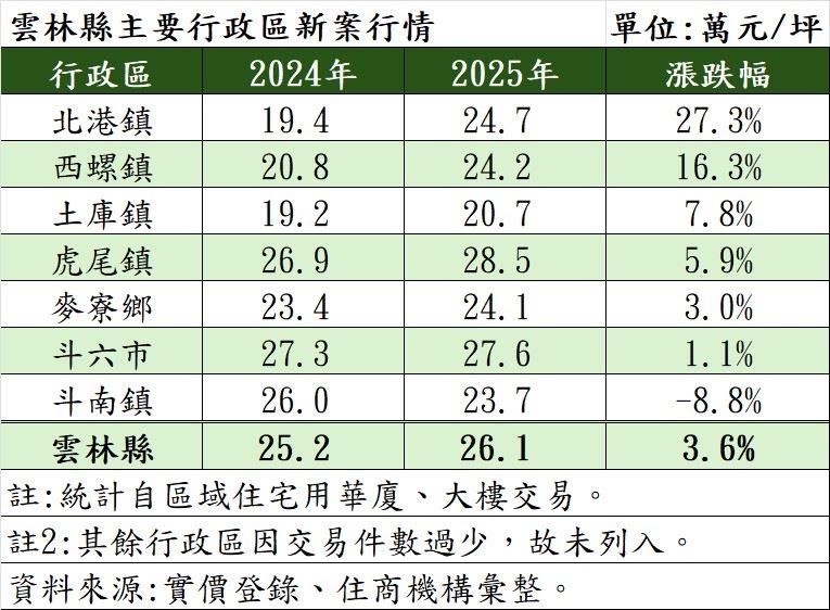 實價登錄數據顯示,長期屬房價凹陷區的雲林縣,今年新案平均行情約每坪26.1萬元。其