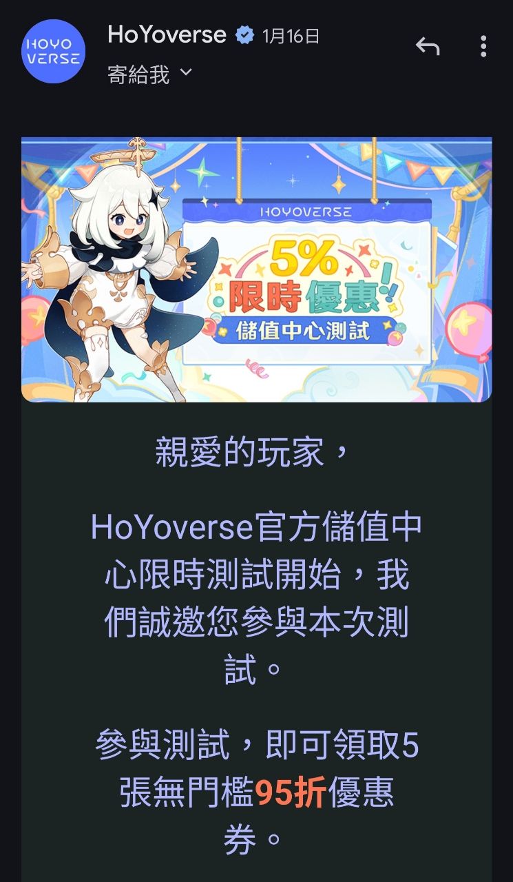 貌似現在官方有要做整個HoYoverse的儲值平臺,之前有收到信是5張95折券,但我都用三