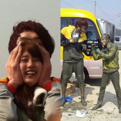 兩張照片中一張是崔洪萬兩手抓著秀智的頭,另外一張是Boom和崔洪萬擺出對決的姿勢。