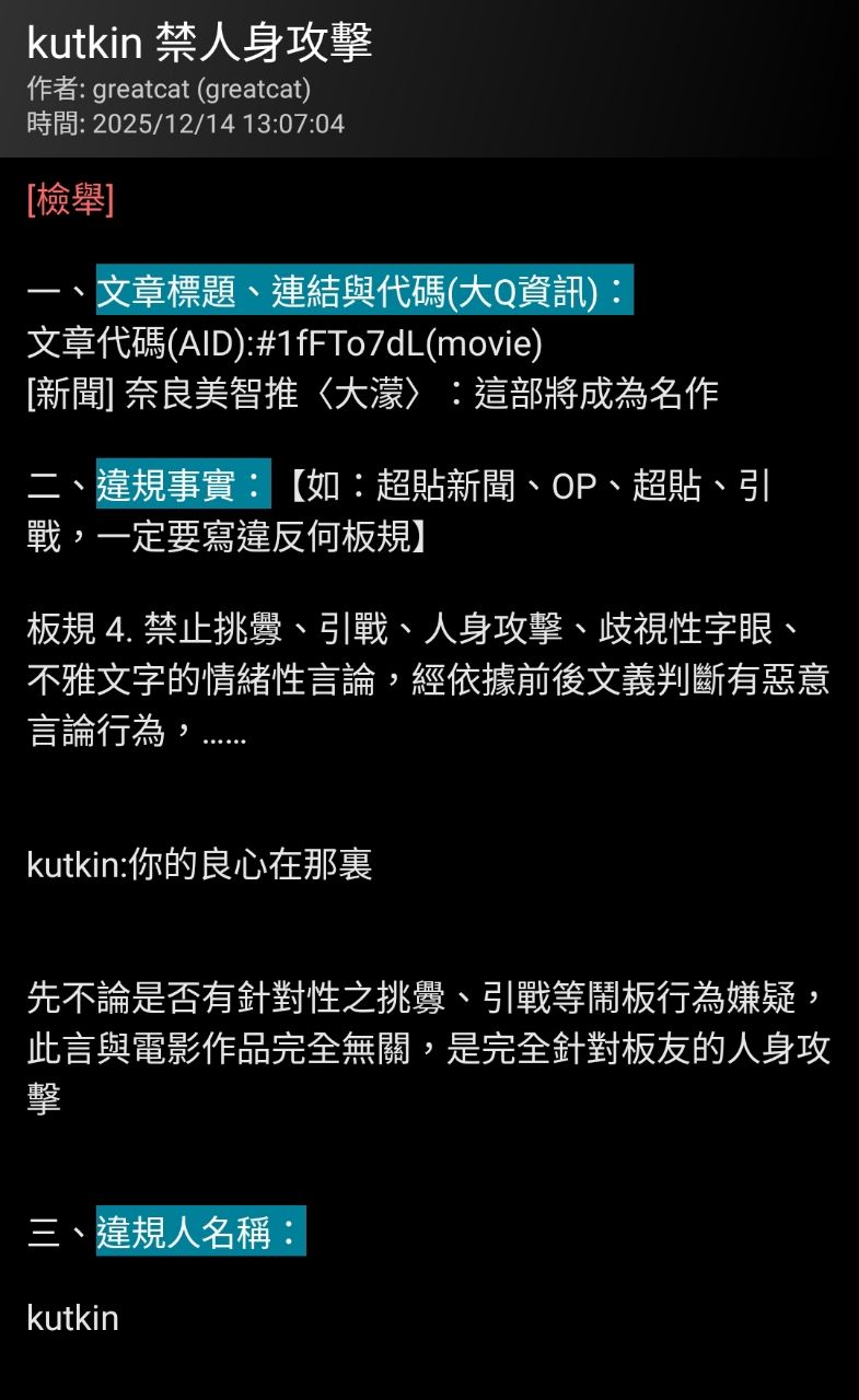 34F:推 kutkin : 「與電影作品完全無關,是完全針對板友的人身攻擊。 12/16 17:24