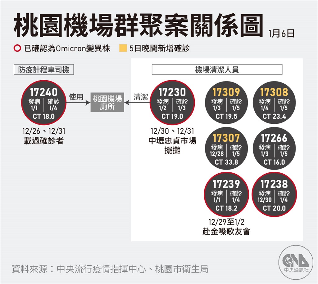 1月5日配合桃園機場擴大檢測,核酸檢測(PCR)為陽性,CT值33.8。
