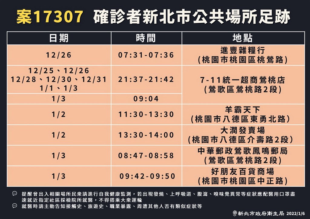 新北市政府衛生局6日公布案17307疫調確診足跡。(新北衛生局提供)中央社記者黃旭昇