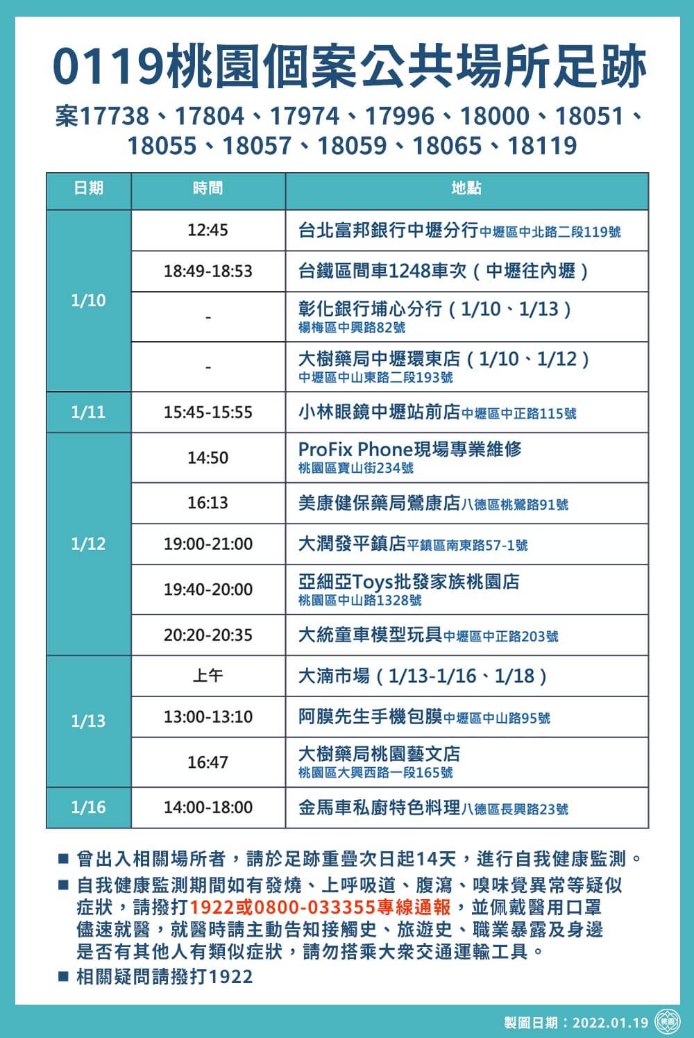 11F:→ Kirari25: 桃園衛生局在1/10公佈個案足跡,裡面有218.161.124.225 01/19 20:25