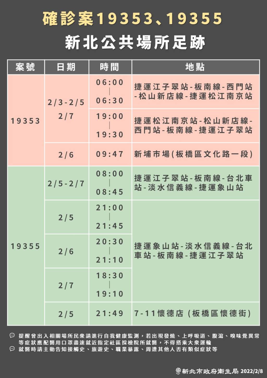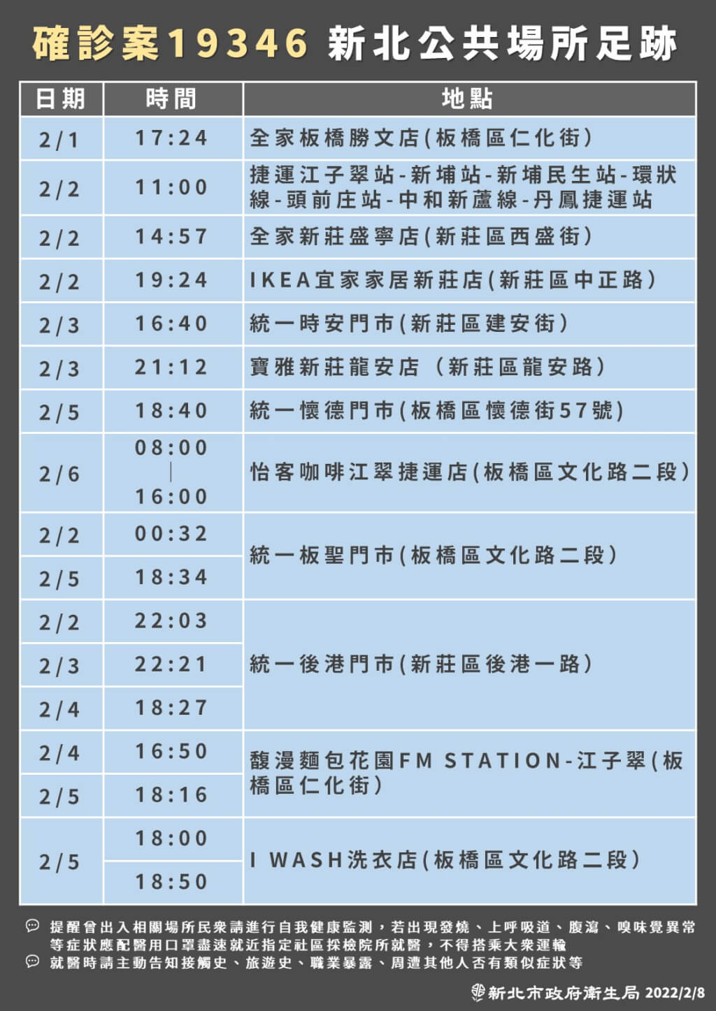 衛生局今天同時公布案19346的公共足跡,於2月1日至5日之間,曾在新北市板橋區、新莊