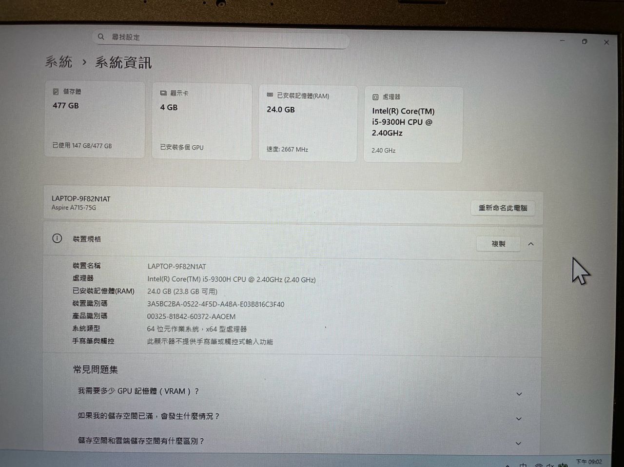 處理器: Inter i5-9300H