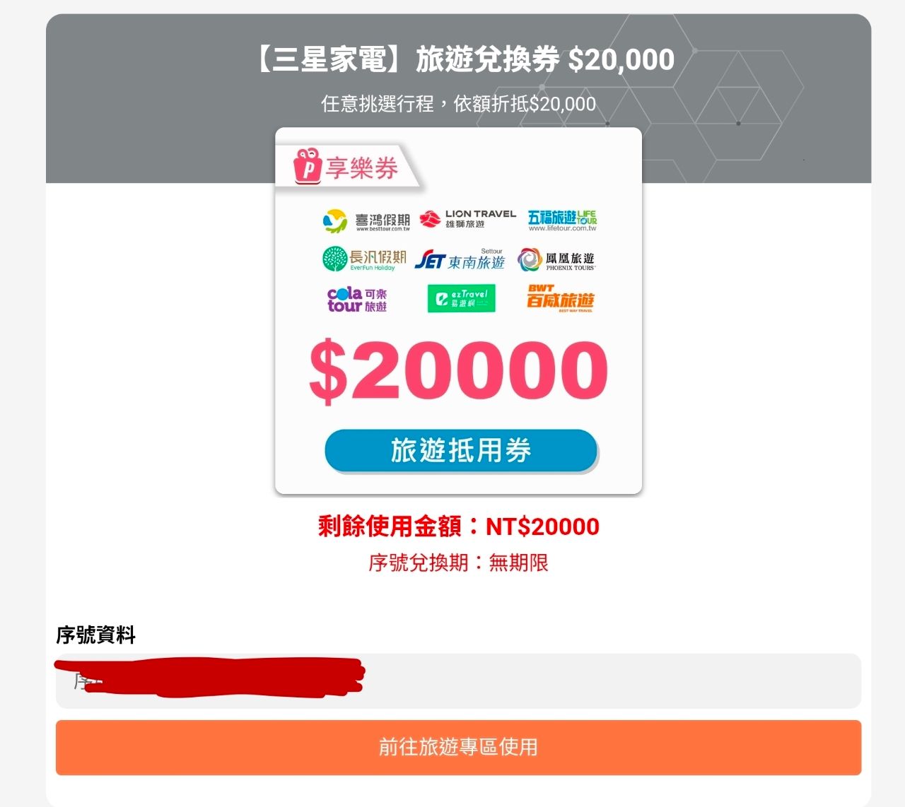 用旅遊券後,客服協助開通帳號購物資格。