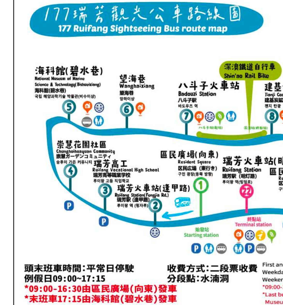 芳区的区民广场站转乘177路线到深澳渔港、黄金博物馆等景点,177路线共2段票,目前