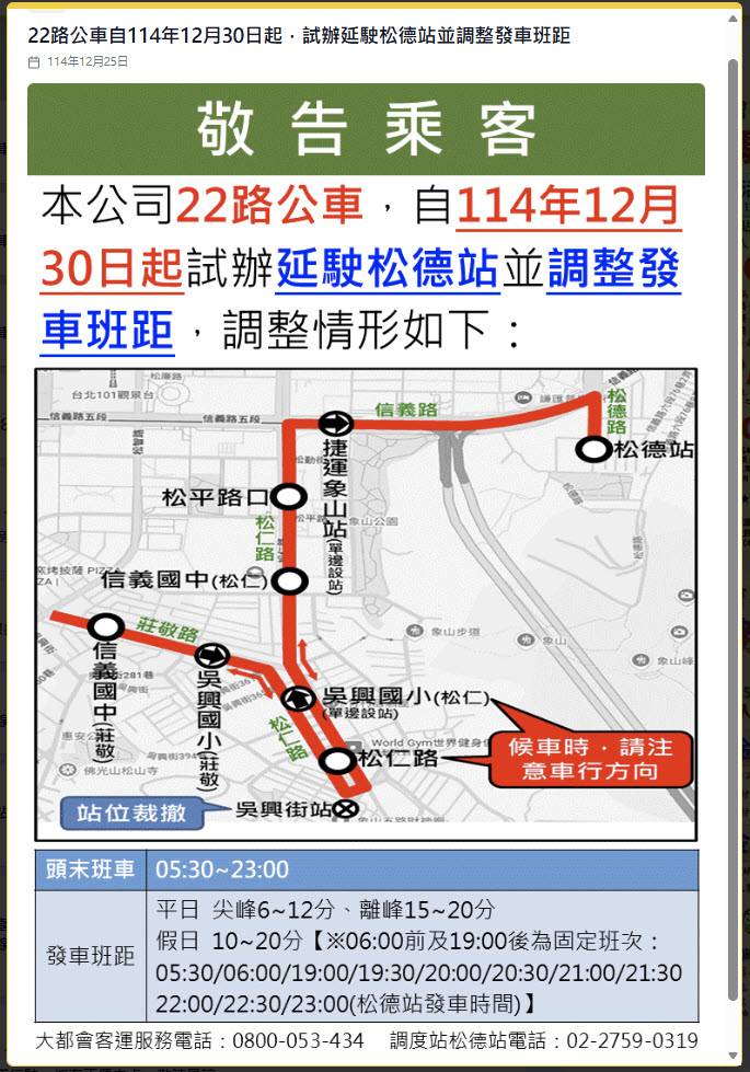 22路公车自114年12月30日起,试办延驶松德站并调整发车班距
