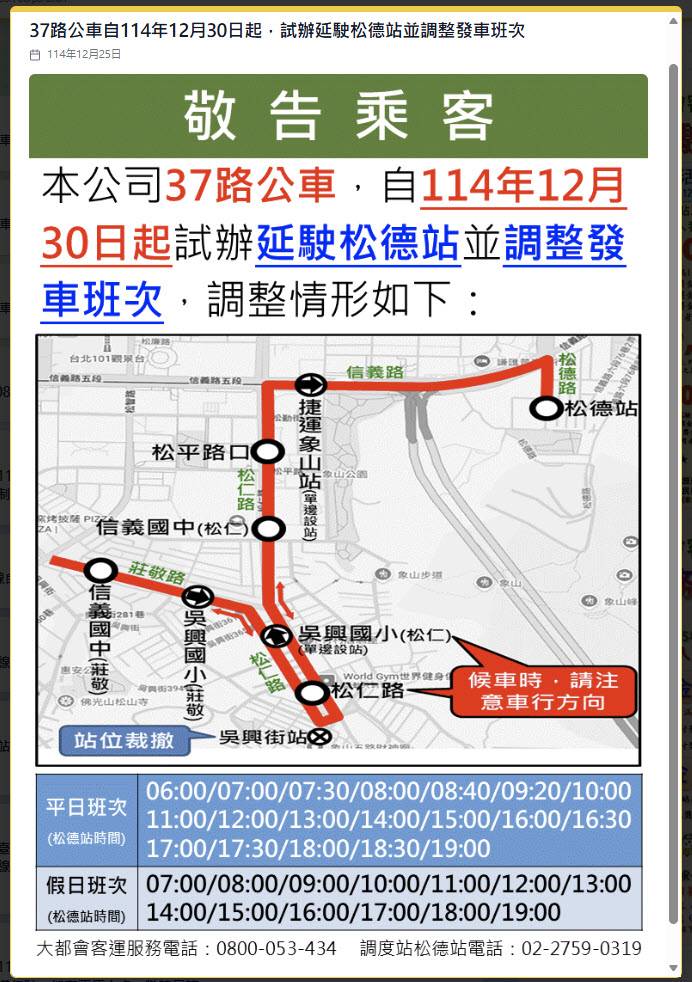 37路公车自114年12月30日起,试办延驶松德站并调整发车班次