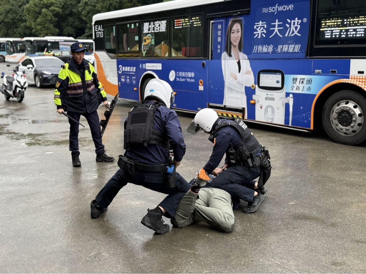 办「行车安全与紧急应变教育训练」,透过高度拟真情境演练,包括歹徒投掷烟雾弹扬言