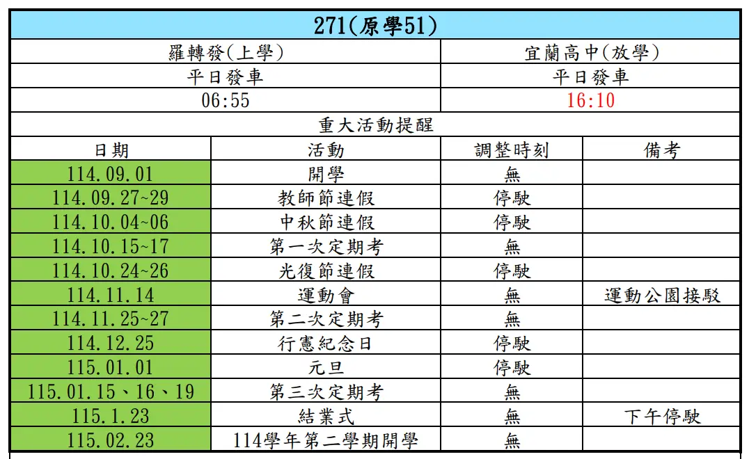 首都客运、葛玛兰客运代驶宜兰劲好行 学51 路线改为 271 路线,路线及时刻表皆不变