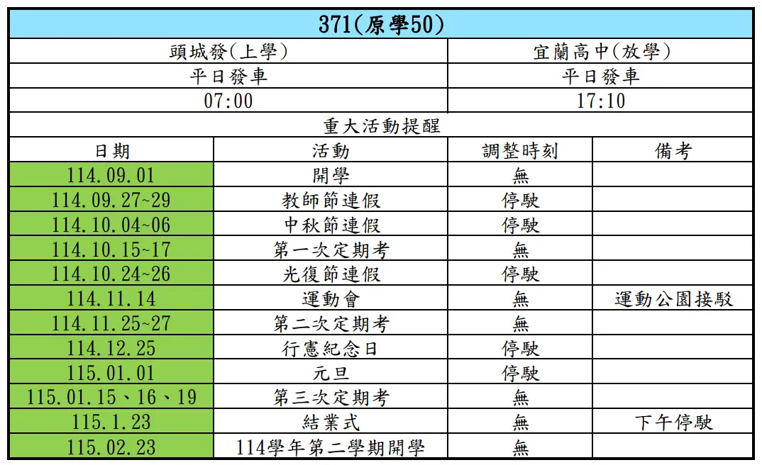国光客运宜兰劲好行 学50 路线改为 371 路线,路线及时刻表皆不变