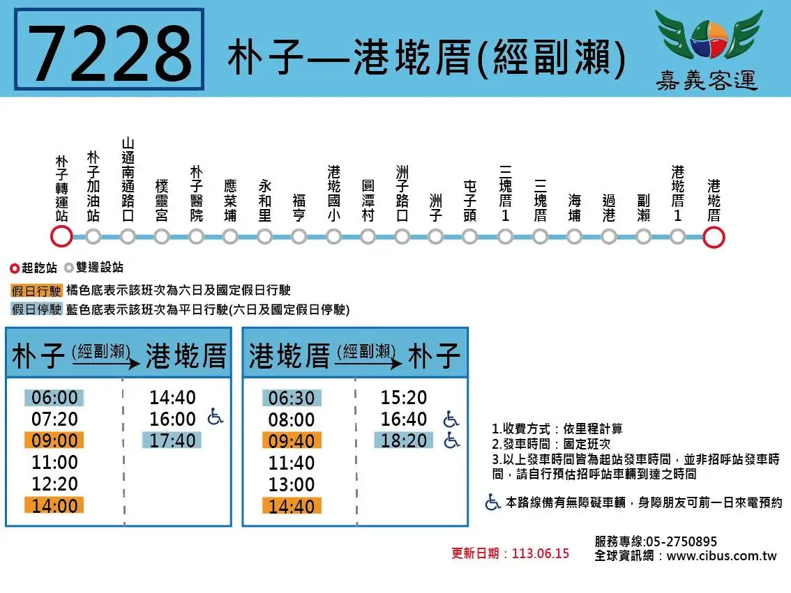 平日 港墘厝往朴子 06:30 → 06:30(7228A)