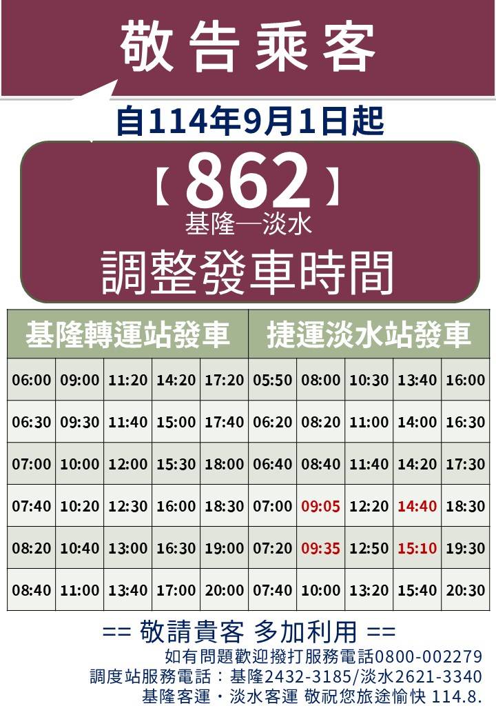 以下更正:08/26 更新公告,新增淡水 14:50/15:20 班次调整为 14:40/15:10 发车。