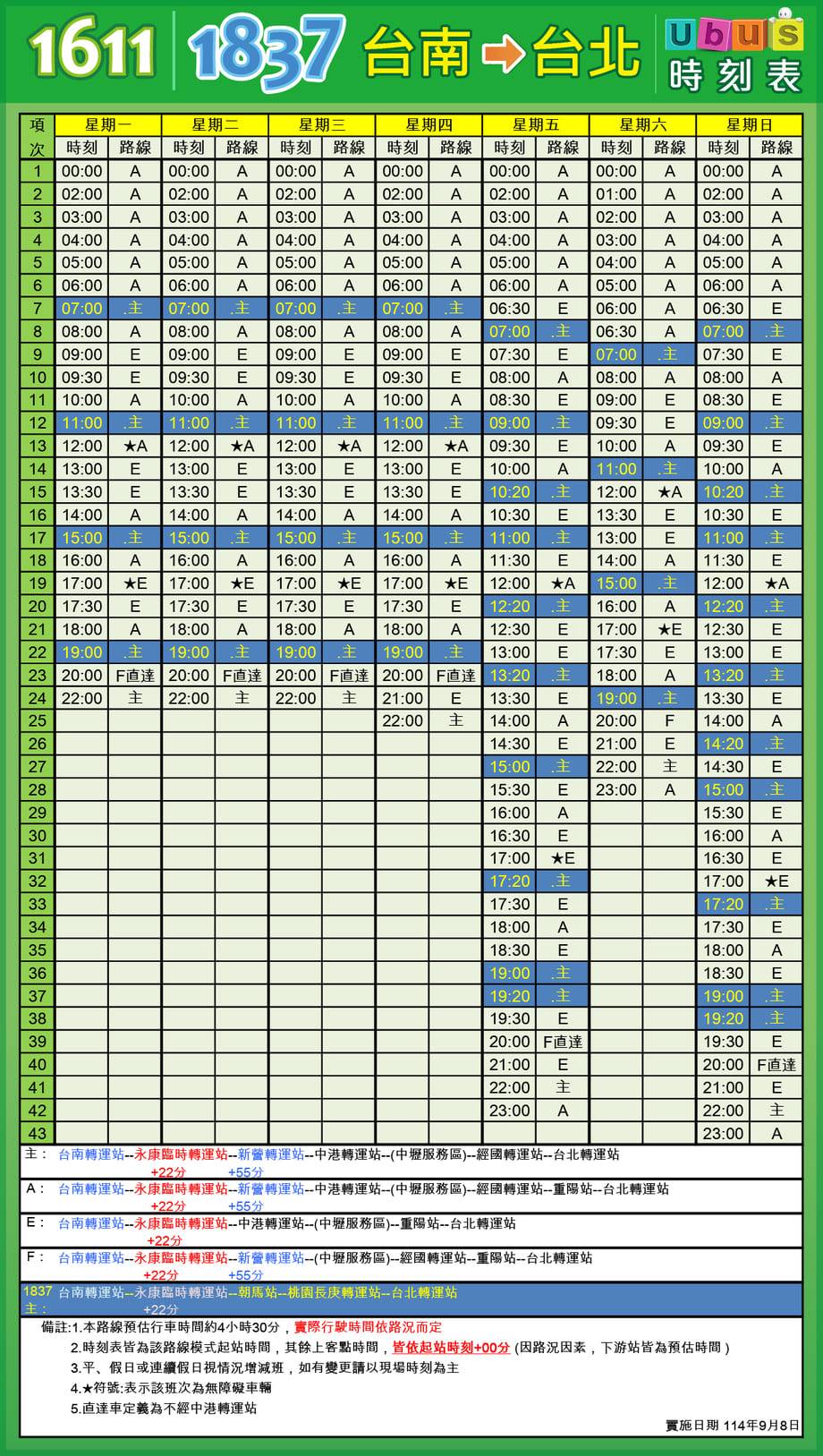16 00 1611A 永康 新营 中港 经国 重阳 台北 1234567