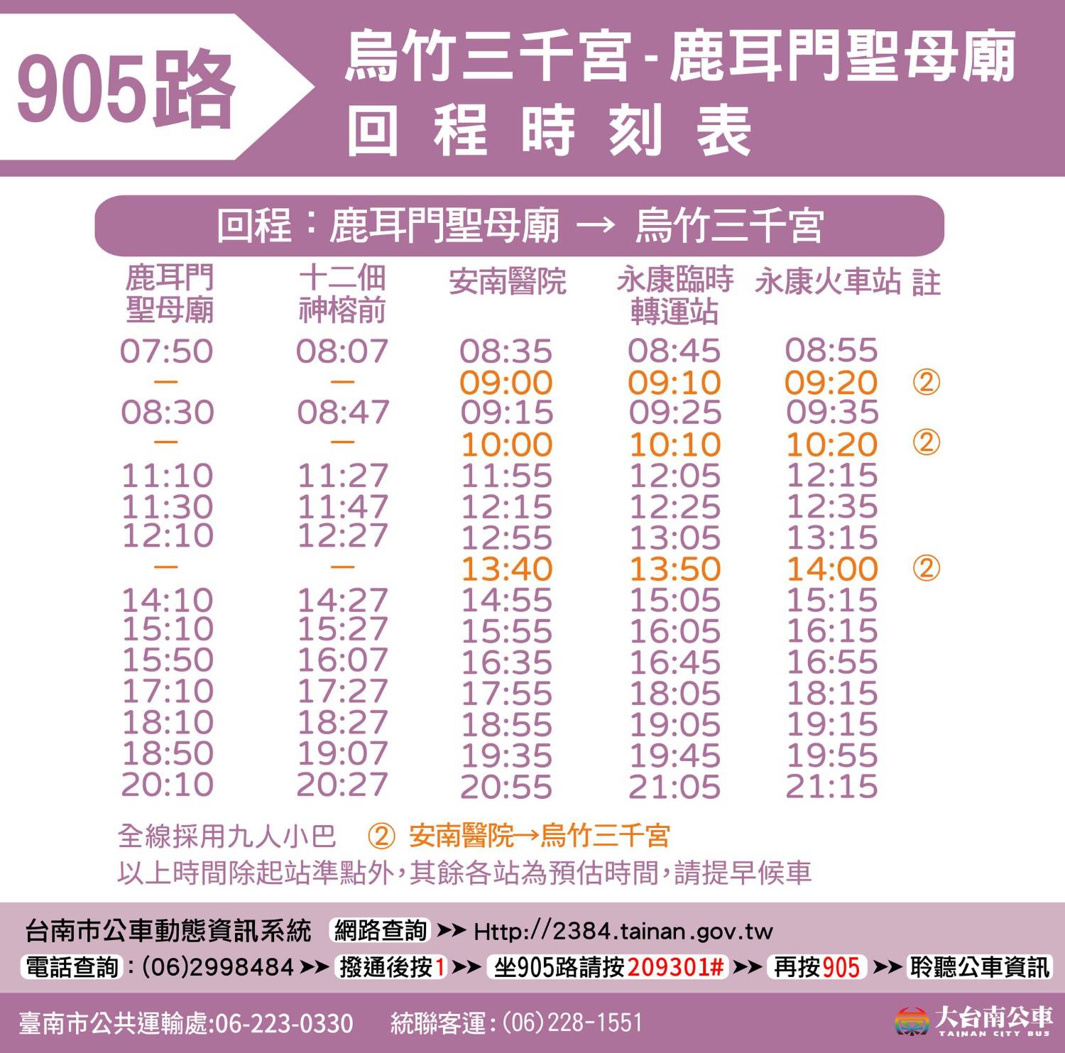1. 由 永康临时转运站 延驶至 乌竹三千宫 发车,并同调整发车时刻表