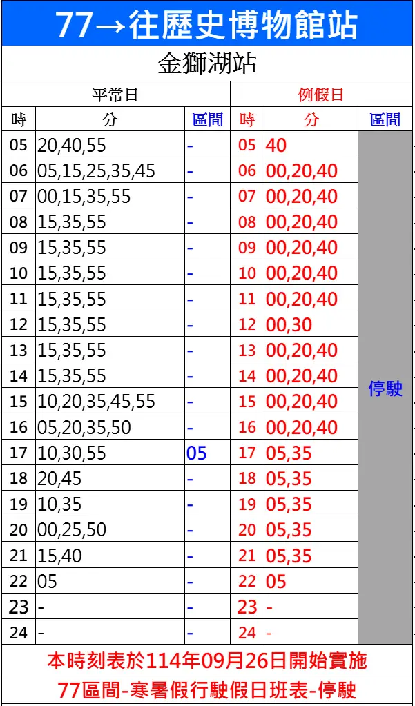 77 平常日 金狮湖站 由 52班次 调增为 55班次