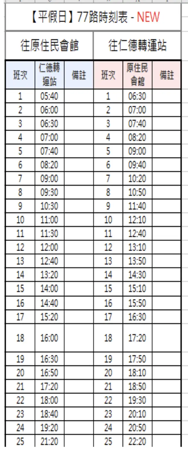 每日 原住民文化会馆 20:00 班次调整为 20:10 发车