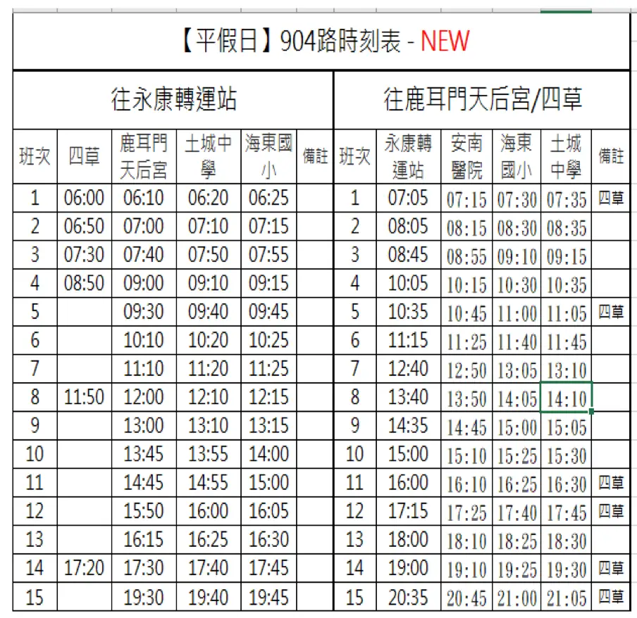 营运路线 大台南公车 904 永康临时转运站-鹿耳门天后宫-四草