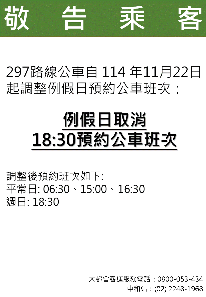 . 周六 18:30 预约班次试办期满停驶,减班後周六停驶