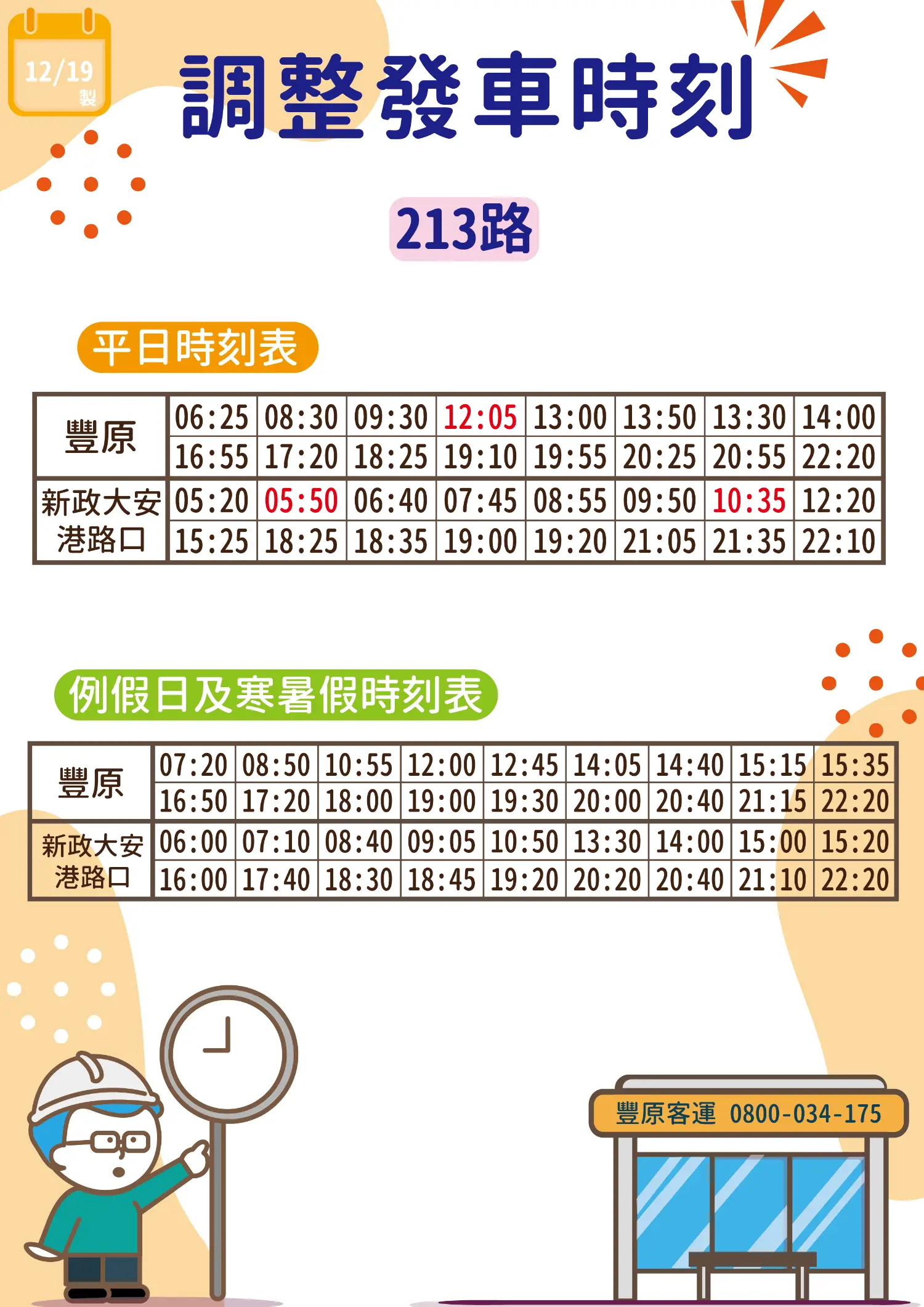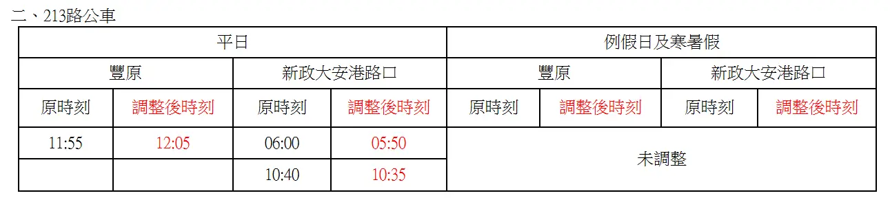 213 平常日 丰原 11:55 班次调整为 12:05 发车
