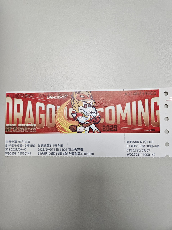 票券日期:9/7 味全VS台钢 大巨蛋 1张实体票
