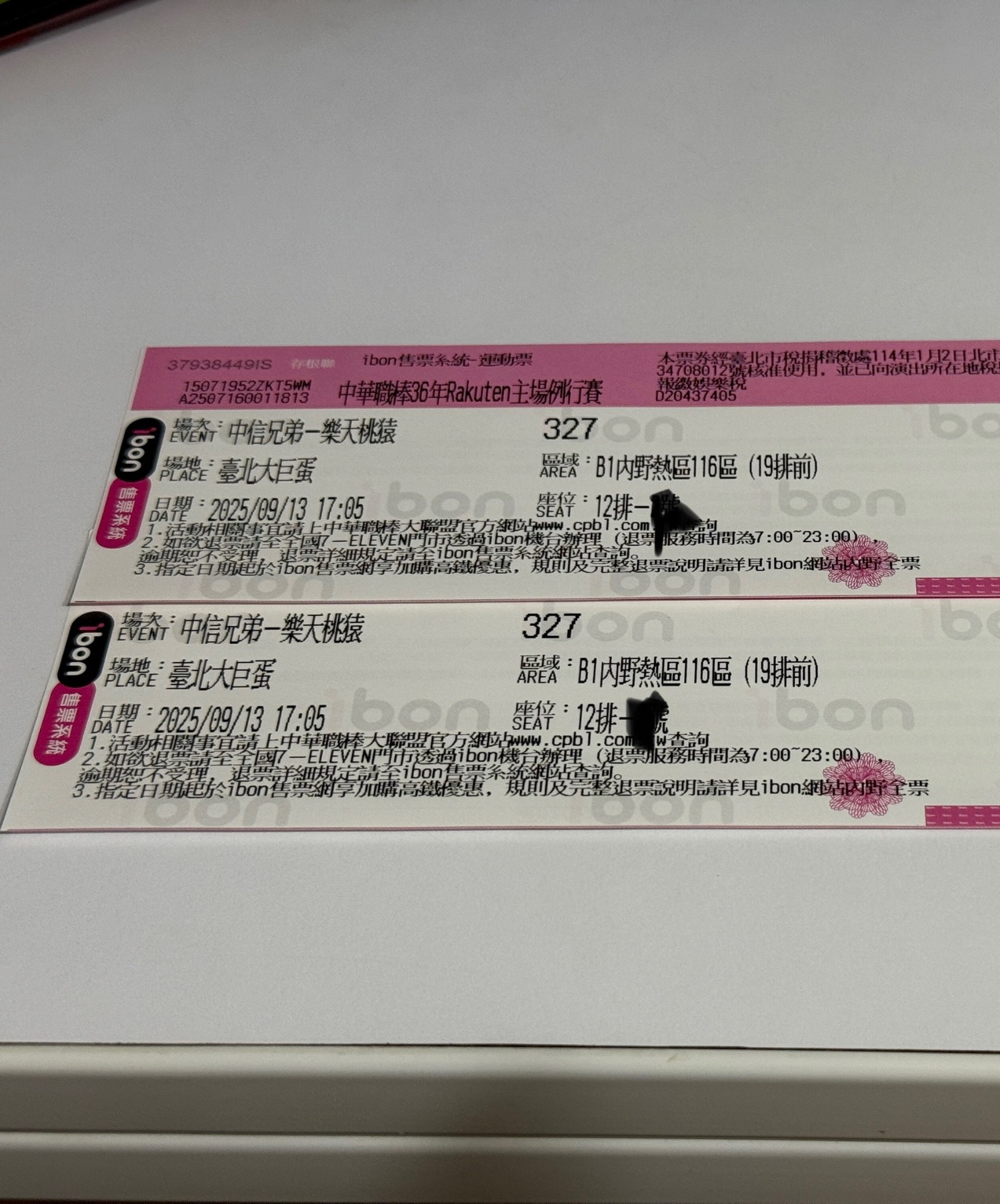 票券日期:9/13(兄弟vs乐天@大巨蛋)、9/14(味全vs统一@新庄) (皆暂售出)