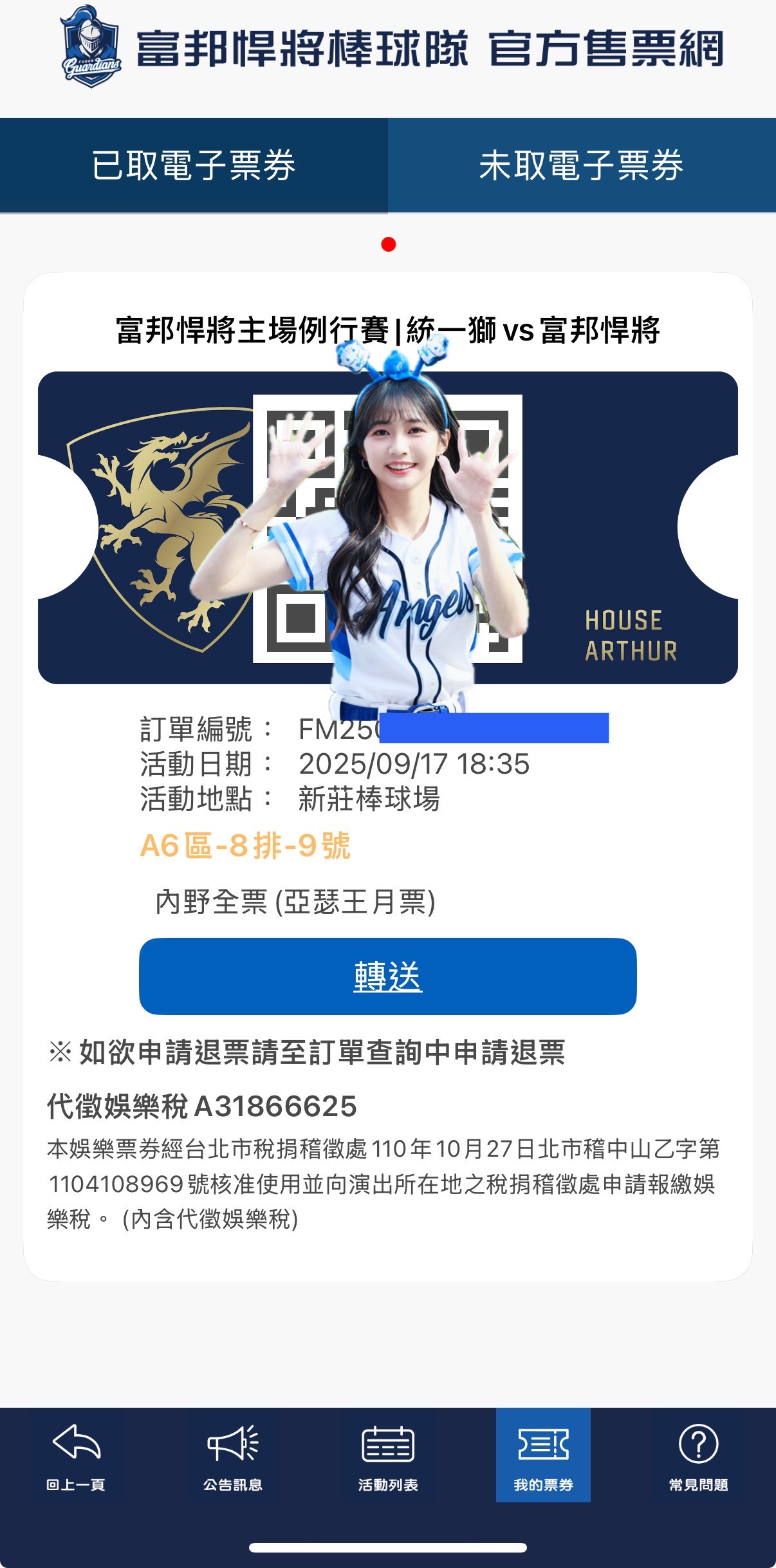 标题[卖票] 9/17 统一 vs 富邦 A6区门票一张