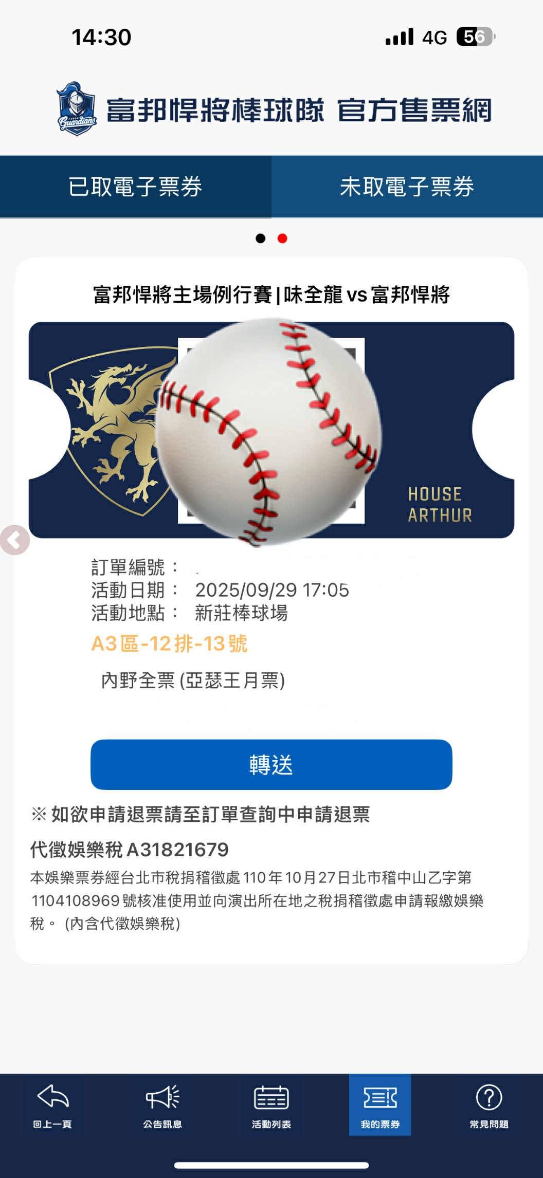 票券日期:9/29 味全 vs. 富邦 新庄棒球场