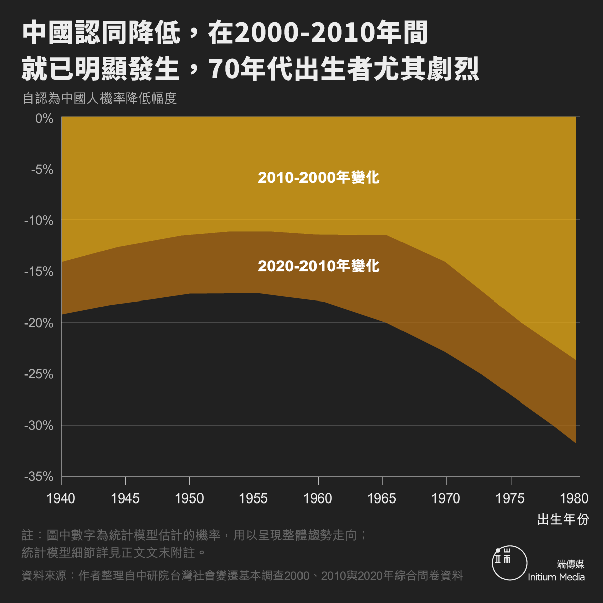 在2000年到2010年间,所有世代的中国认同机率就已经大幅下降,下降幅度都在一成以上