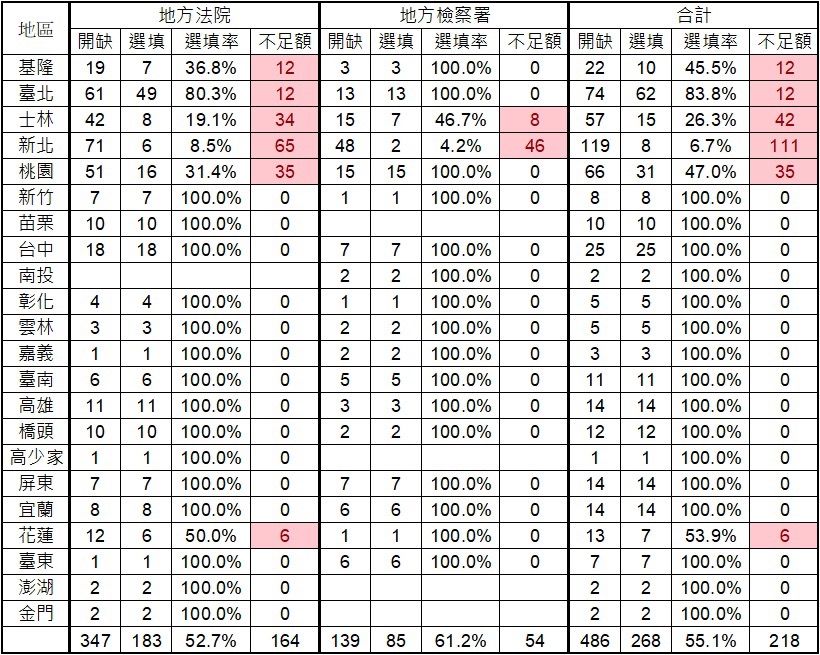 近期书记官缺额问题在网路上引发讨论。根据去年录取与开缺数字,新北地方法院开缺最