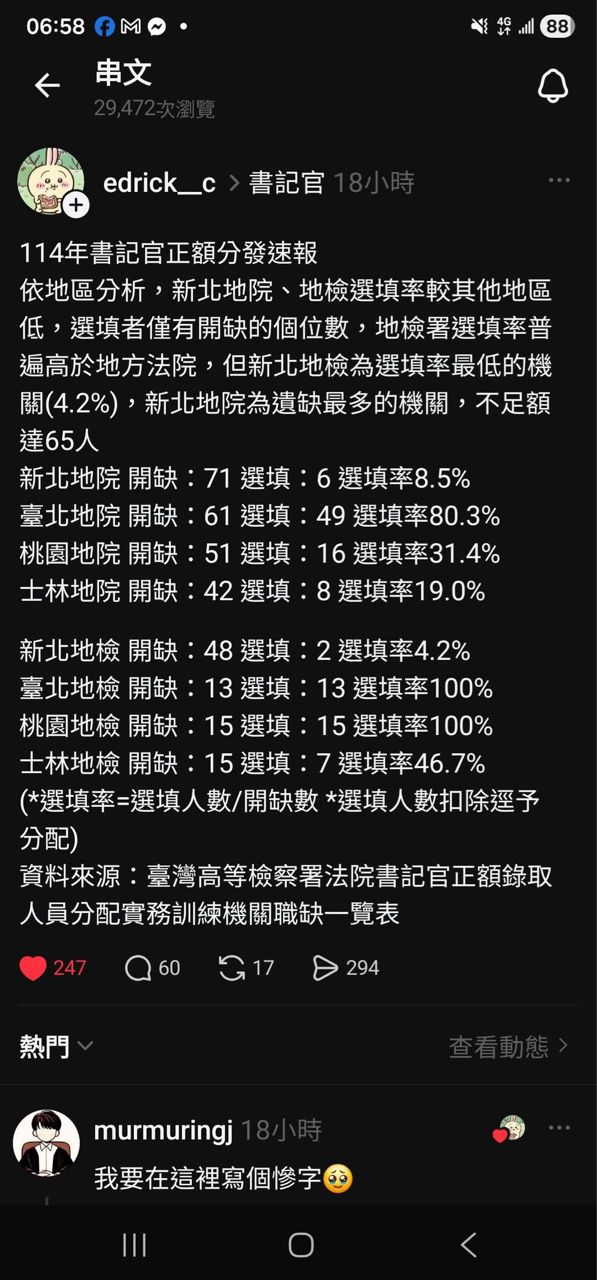 也有许多书记官上网表示,单位未补上新人,甚至有人纷纷离职。书记官流失问题严重,