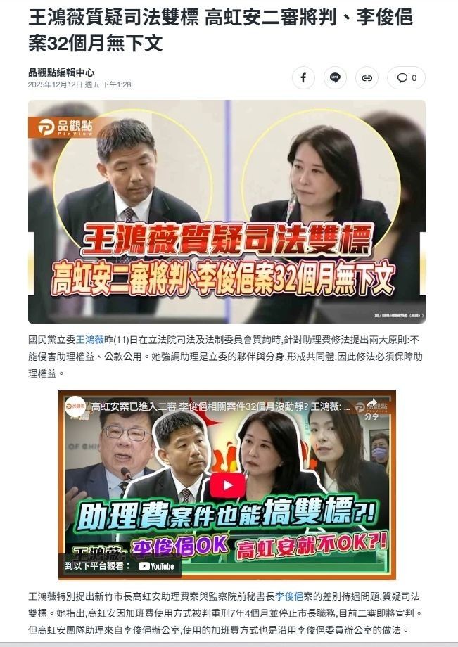 标题[新闻] 王婉谕看高虹安二审判决示警:台湾政治