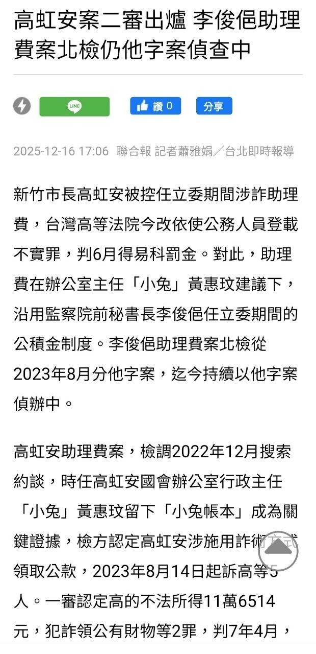 钱本质上就是立委的补助,所以不构成贪污,因此,二审才会判决高虹安「贪污」无罪,仅