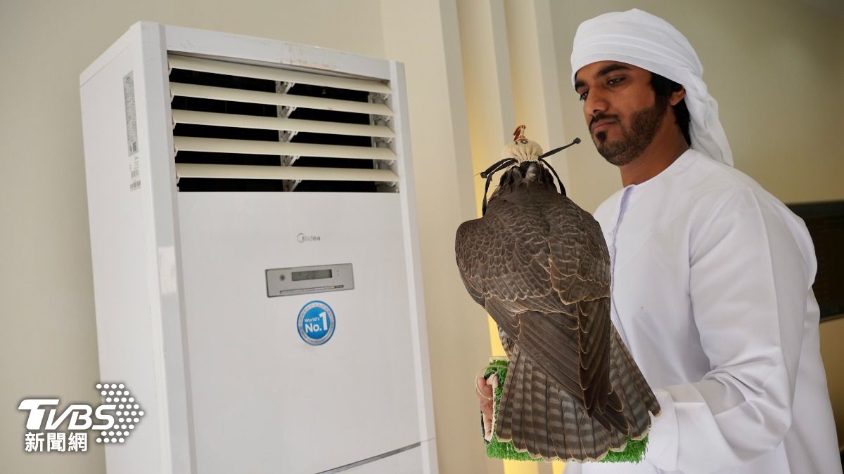 猎隼在阿布达比是重要的文化和财富象徵,图为饲主让猎隼在冷气机前吹冷气。(图/区
