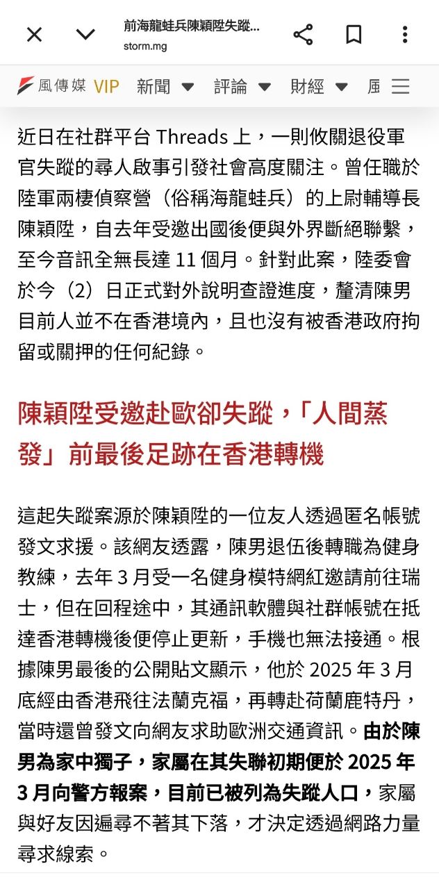 完整新闻标题:退役海龙蛙兵香港转机「人间蒸发11个月」 陆委会回应了