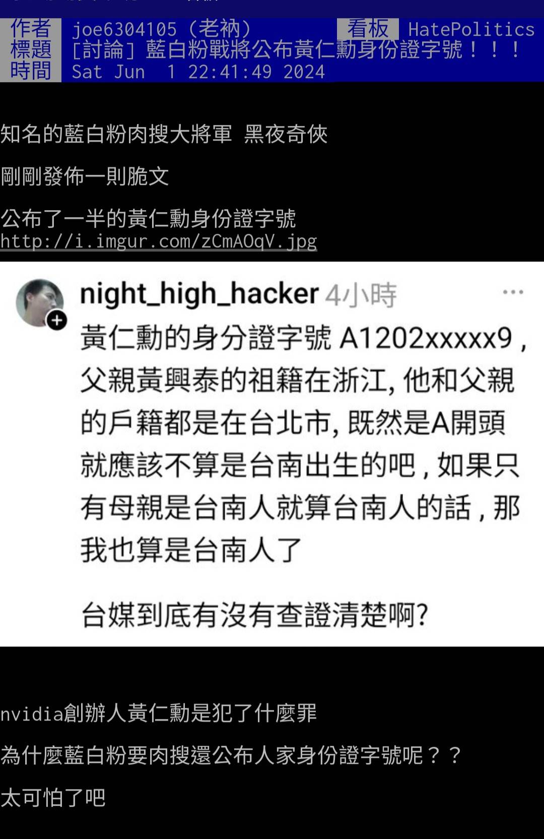 10F:→ painvano: 那蠢草肉搜黄仁勳身分证字号呢??? 1.162.116.96 12/07 18:15