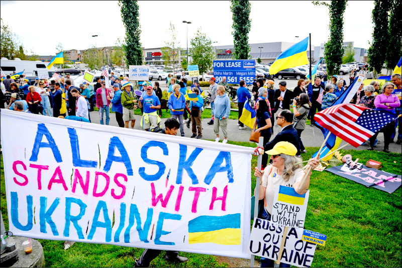 在川普和普廷抵达前夕,阿拉斯加安克拉治民众上街抗议,拉起「阿拉斯加与乌克兰站在