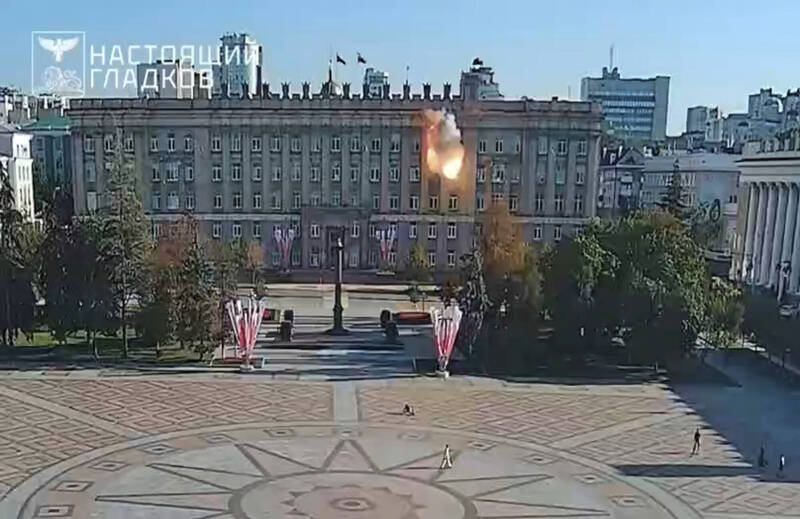 俄罗斯城市贝尔哥罗德的1栋行政大楼,在遭乌军以无人机攻击後起火燃烧。(美联社)