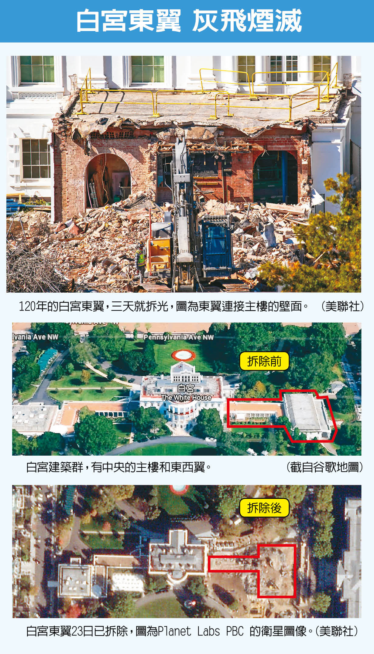 【明报专讯】美国白宫东翼周四(23日)被完全拆卸,为总统特朗普推动兴建全新宴会厅
