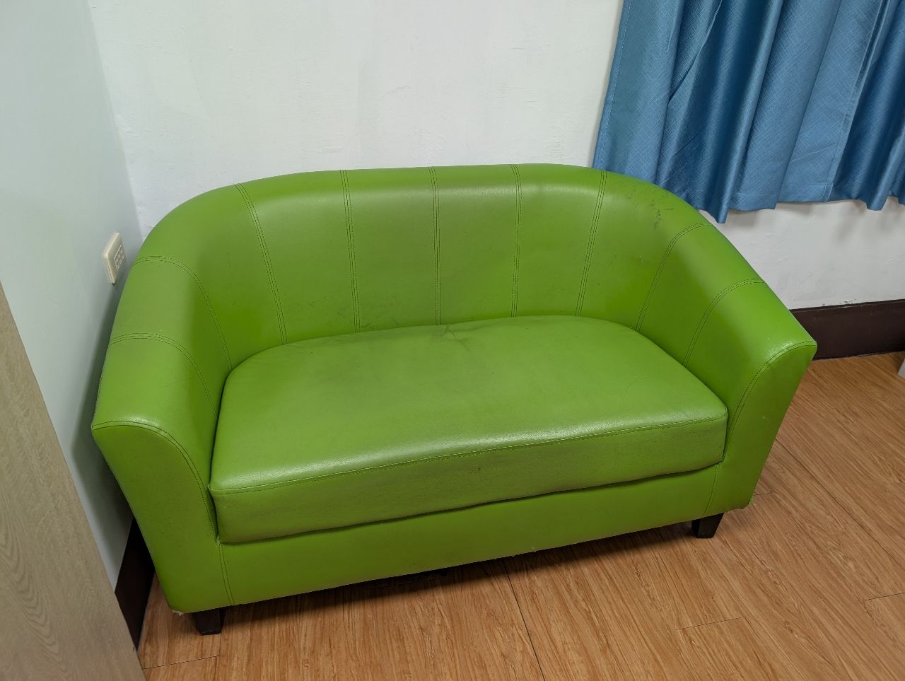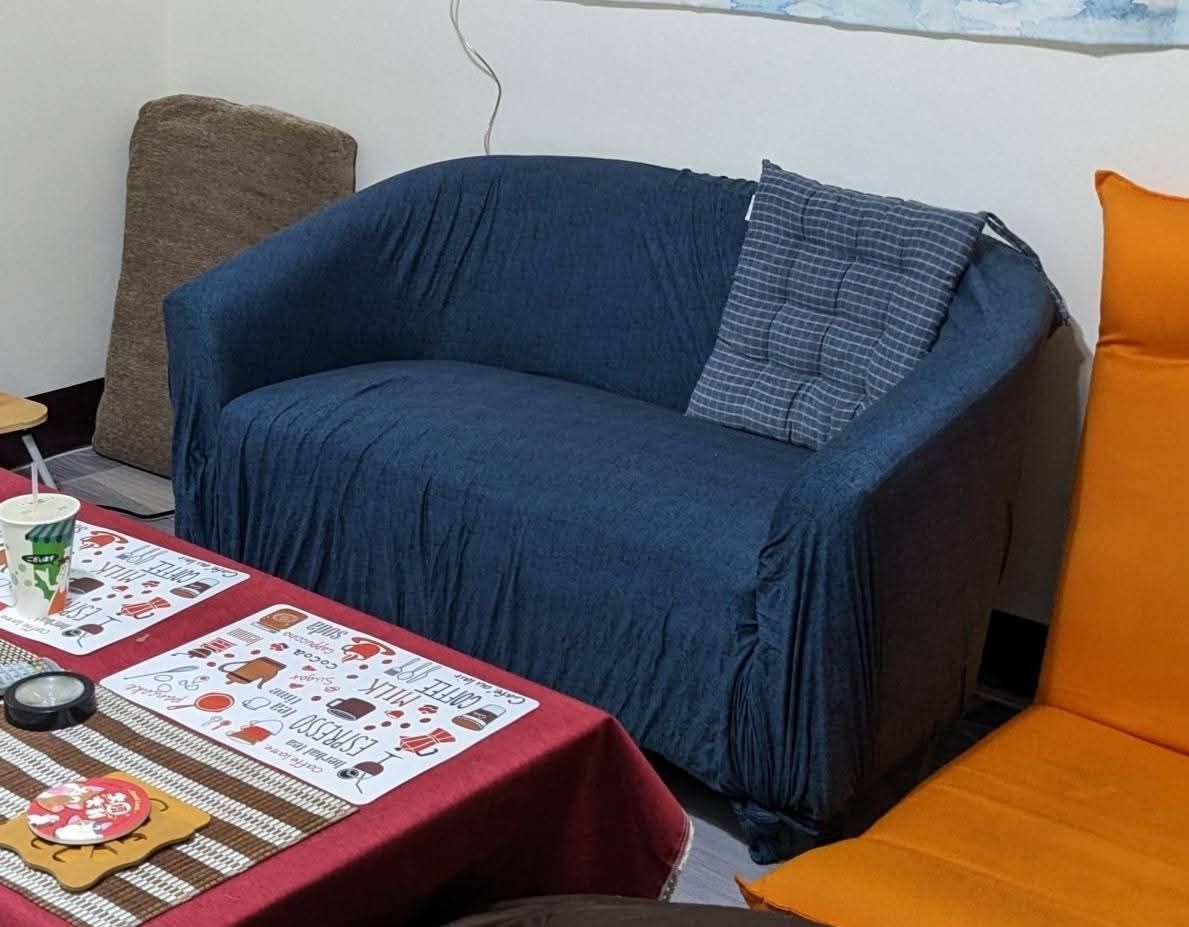 赠送绿色堪用双人沙发,外表皆有瑕疵(脏污、破皮等等),坐垫微凹陷,可自行购买沙