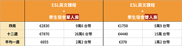 在欧美:四周ESL英文课程+学生宿舍 = 大约台币$8万~$13万