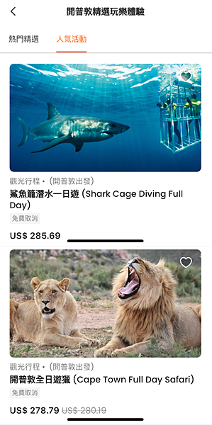EX: 和鲨鱼游泳、酒庄体验、Safari动物迁徙、跳伞等