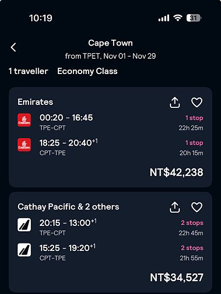 机票部分 ✈台湾->南非 的班机目前没有直飞的