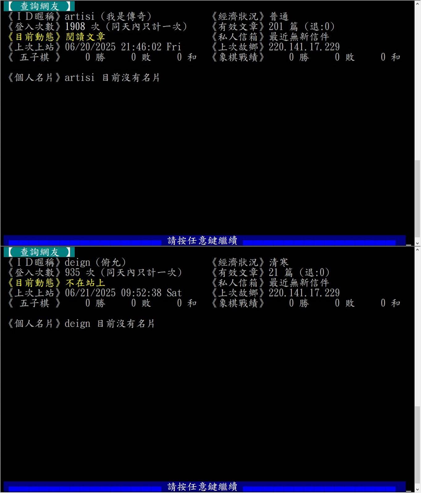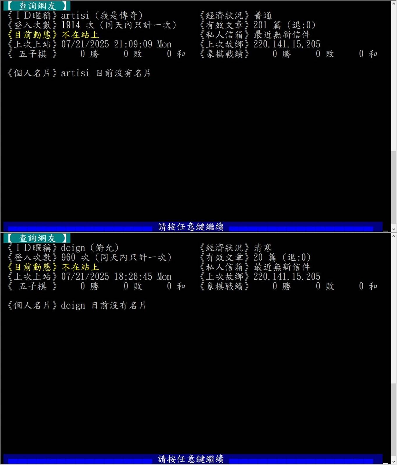 《登入次数》935 次 (同天内只计一次) 《有效文章》21 篇 (退:0)